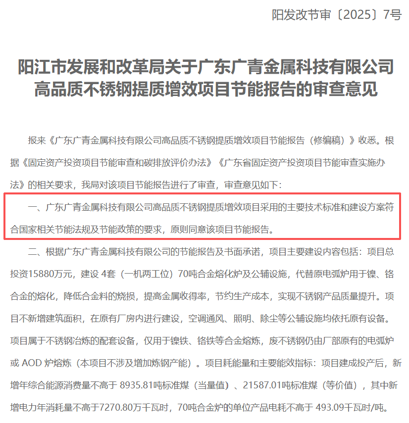 2025年10月15日,陽江市發(fā)展和改革局就廣東廣青金屬科技有限公司高品質(zhì)不銹鋼提質(zhì)增效項目節(jié)能報告作出審查意見,據(jù)顯示,該項目節(jié)能報告獲原則同意通過。